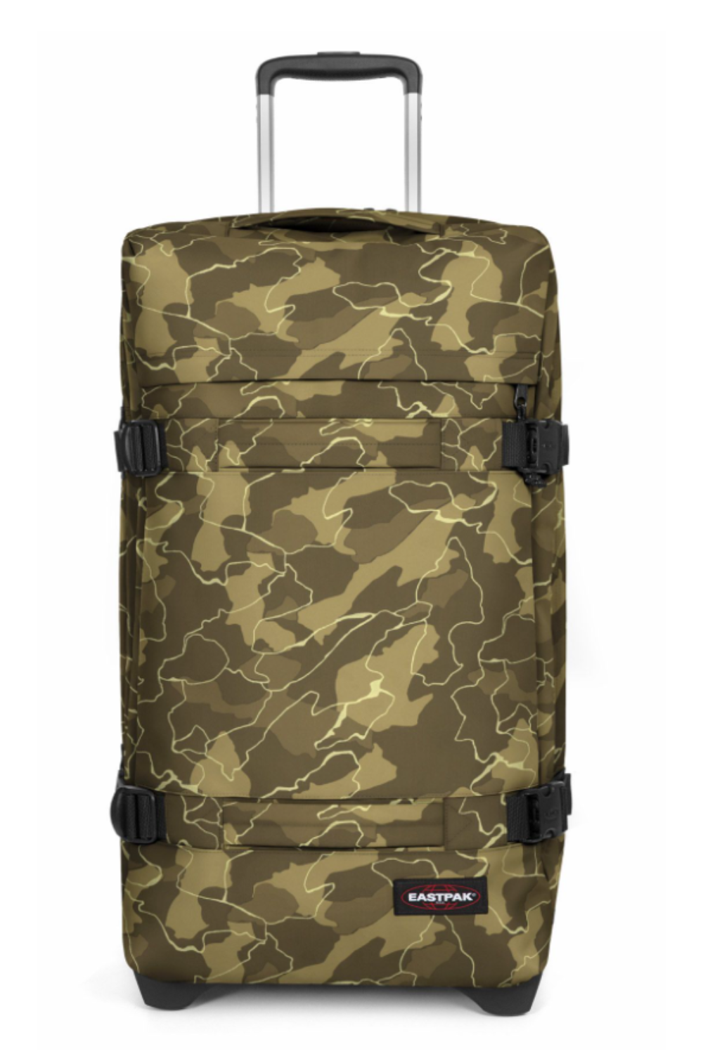 The sleek and smart update of Eastpak's wheeled luggage stands out in classic camo print with a vibrant flash of colour. Load up the double compartments and secure your belongings with the integrated lock. This durable suitcase features aluminium tubes and protective skids, and stylish finishes including contrasting grey trims, mesh details and diamond embossing on the handle.